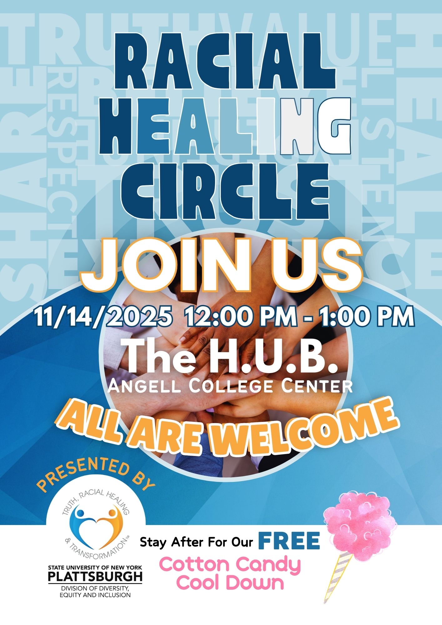 Join us for TRHT Rx Racial Healing Circles on the second Friday of each month from 12:00-1:00 pm in the H.U.B.